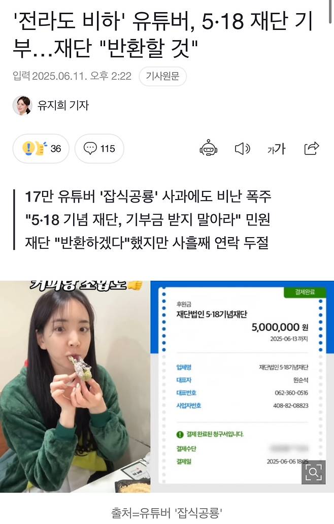 '전라도 비하' 유튜버, 5·18 재단 기부…재단 "반환할 것"