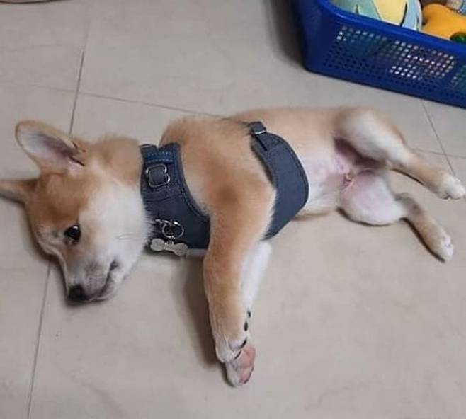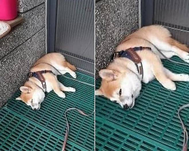 어느덧 1시간 넘게 바닥에 누워 있었다는 강아지. 도대체 산책 가는 것이 얼마나 싫었으면 1시간 동안이나 바닥에 누울 생각을 했을까요.