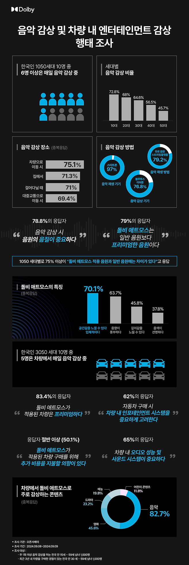 중국 내 차량 소유자 1,200여 명을 대상으로 올해 4월 진행한 해당 조사에 따르면, 응답자의 97%가 돌비 기술을 인지하고 있으며, 5명 중 4명은 돌비 경험이 차량 내 엔터테인먼트 수준을 매우 향상시킨다고 답했다. 또한, 향후 6개월 내 신차를 구매할 의향이 있는 응답자 10명 중 9명은 돌비 비전과 돌비 애트모스가 탑재된 모델에 관심이 있는 것으로 나타났다.