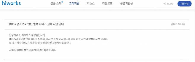 하이웍스는 이날 홈페이지 공지를 통해 "DDOS(분산서비스 거부) 공격으로 인해 하이웍스 메일과 게시판 등 일부 서비스에 대해 접속 지연이 발생하고 있다"며 "현재 처리 중으로 처리 완료 및 정상화시 재공지할 것"이라고 밝혔다.
