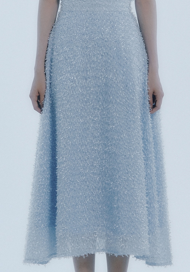 격자무늬가 새겨진 쉬폰 소재 위에 깃털 느낌의 자수가 놓여져 있는 유니크한 소재감이 특징이다.