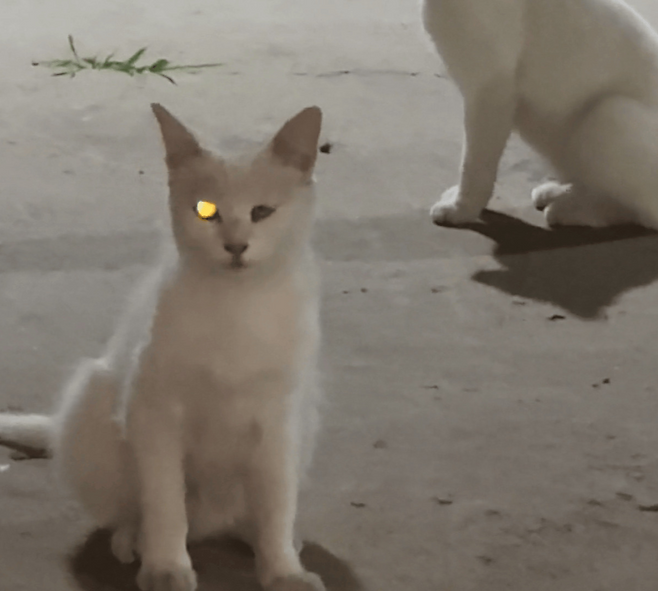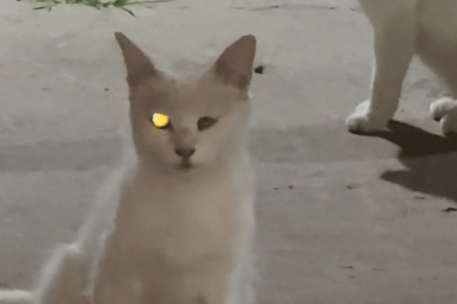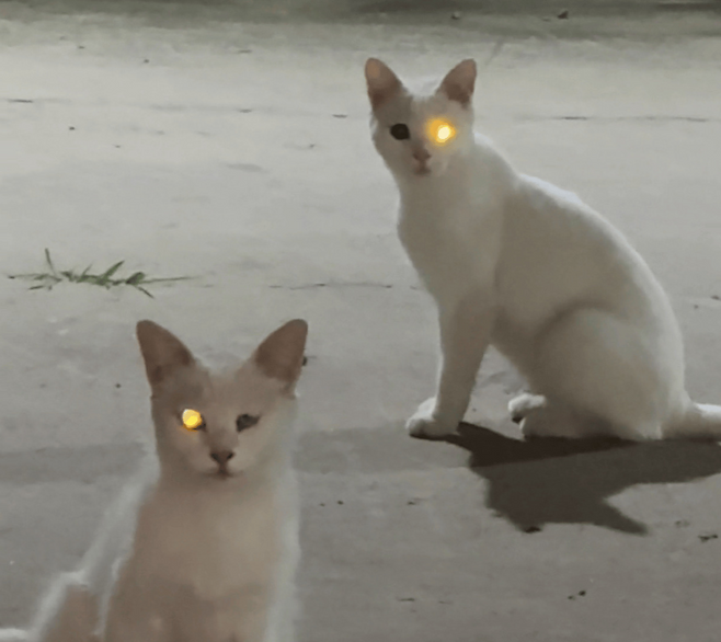 호기심 어린 표정으로 여성은 다시 한번 고양이를 불렀고, 처음에는 등을 돌리고 있던 다른 고양이도 고개를 휙 돌렸습니다. 그 고양이의 왼쪽 눈 역시 밝게 빛났습니다. 순식간에 두 마리 고양이의 눈이 마치 작은 미니 탐조등처럼 번갈아 빛났습니다.
