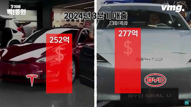 한국 시장은 사실 미국 빼고 거의 대부분의 나라에서 차를 팔고 있는 BYD가 보기에 그리 큰 시장이 아닙니다. BYD는 전기차뿐 아니라, 모터와 엔진이 결합된 플러그인 하이브리드 차량도 판매하고 있습니다. 2024년 3분기 BYD는 전 세계에서 총 113만 대를 팔아 치웠습니다. 이 중 순수 전기차는 44만 대였고요. 순수 전기차만 만드는 테슬라가 3분기 46만 대를 팔았으니, 전체 차량 판매량으로는 BYD가 테슬라의 3배가 나온 겁니다. 단순히 판매 대수 말고 매출도 이번 3분기에 BYD가 처음으로 테슬라를 앞섰습니다. 테슬라 전체 매출이 252억 달러, 우리 돈 35조 원이 나왔는데, BYD가 277억 달러, 38조 원을 기록한 겁니다. 외신들은 일제히 '세계 1위 전기차 기업은 테슬라가 아닌 BYD'라는 기사를 내기도 했습니다.