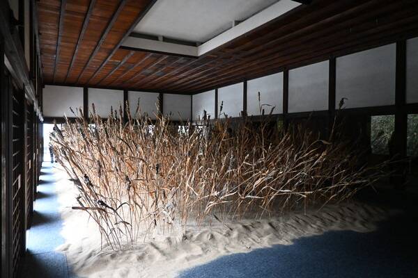 작품은 창, 바닥, 서까래의 짙은 목재와 하얀 벽의 대비가 만드는 일본 건축의 절제미가 느껴지는 방에 설치되어 있는데요. 모래가 깔린 바닥에 금칠이 된 곡식이 어지러이 서 있습니다. 한 바퀴 돌다 보면 밭 가운데에 뱀 한 마리와 책이 보이는데요. 에덴 동산에서의 유혹과 추방, 역경과 극복을 암시하기 위한 것일까요? 같은 방에는 <요셉의 꿈>(2013)이, 옆방에는 <데메테르>(2014)가 전시되어 있어 추운 겨울과 시련을 견딘 후 다시 힘차게 생명을 이어가는 희망의 메시지가 분명히 부각됩니다.
