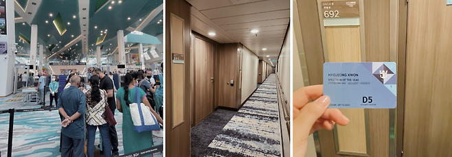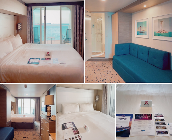 싱가포르 마리나 베이 크루즈센터(MBCCS, Marina Bay Cruise Centre Singapore)에서 승선 준비를 한다. 터미널 수속 과정에서 카드키를 발급받는다. 객실 키이면서 신분증, 결제 수단 역할을 하는 마스터키다. 크루즈를 돌아다닐 때마다 보여줘야 하기때문에 잘 들고 다녀야 한다. 객실이 굉장히 많다. 기나긴 통로를 지나서 방문을 열면 이런 광경이 펼쳐진다.