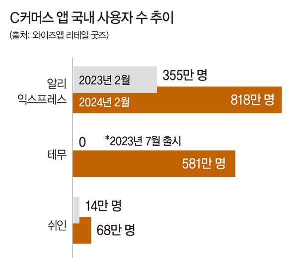 지난 1년간 국내 소비자들의 C커머스 이용은 폭증했다. 앱 분석 서비스 와이즈앱 리테일 굿즈에 따르면 2024년 2월 기준 알리익스프레스 국내 사용자는 818만 명, 테무는 581만 명에 이른다. 올해 1월부터 7월까지 알리익스프레스와 테무의 결제 추정 금액이 2조2938억 원이란 집계도 나온다.