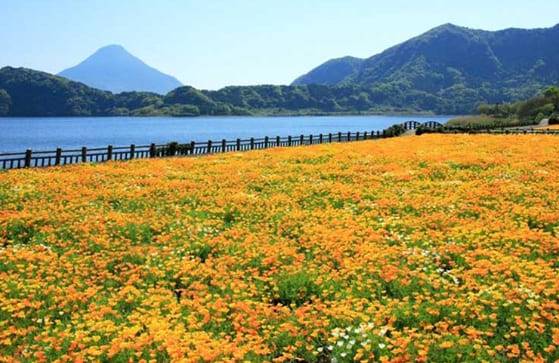 이케다 호수는 주변 15km, 수심 233m의 큐슈 최대의 칼데라 호수인데요. 호수는 맑고 남색 빛을 띠고 있으며, 사츠마 후지라 불리는 카이몬산을 바라볼 수 있습니다.