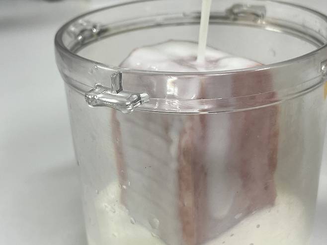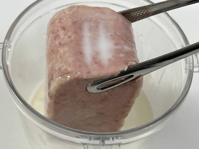 깊숙한 깊이의 통에 햄을 넣고 우유를 붓습니다. 가급적 햄이 잠길 정도로 넉넉히 부어주는 것이 좋습니다.