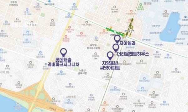 최근에는 임차인 찾기 더욱 힘든 상황이 됐습니다. 자양호반써밋과 건대입구역 사이에 들어선 건대입구역 자이엘라, 더라움펜트하우스 오피스텔에도 상가가 들어서 공급량은 더 증가했습니다.