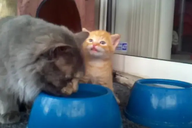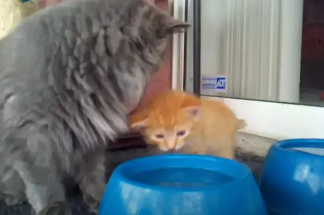 어미는 먼저 물을 핥기 시작했습니다. 이를 본 새끼 고양이도 같은 동작을 시도했습니다.