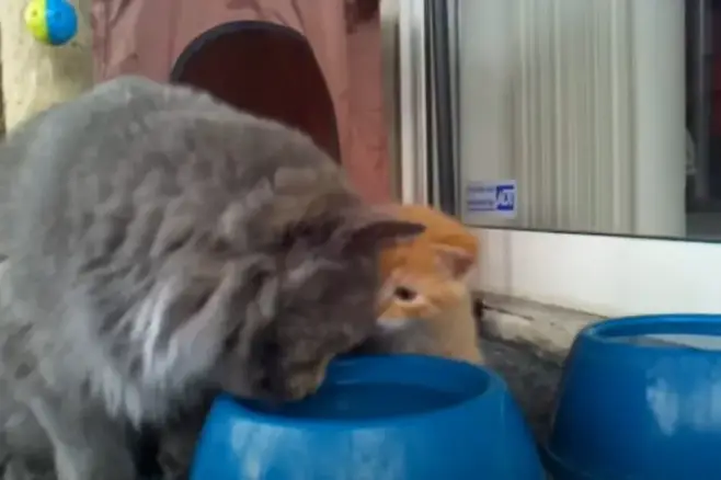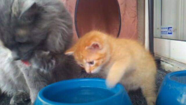 새끼 고양이는 낯선 물그릇에 조심스럽게 다가갔습니다. 어미 고양이는 바로 옆에서 시범을 보이며 도움을 줬습니다.