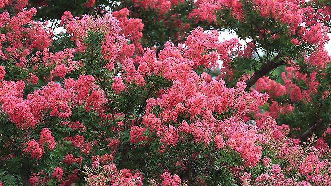 꽃잎은 바람에 흩날리고, 고목은 그 자리를 수백 번도 넘게 지켜낸 듯 묵직하다. 한 번 지고 끝나는 것이 아니라, 피고 지기를 반복하며 약 석 달 동안 꽃을 이어가는 배롱나무의 생은 그 자체로도 시처럼 다가온다.