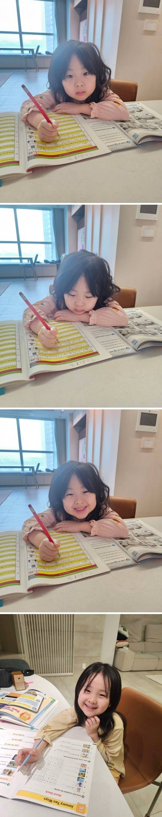 단어 쓰기부터 짧은 문장 구성까지 혼자서 척척 풀어내는 모습은 보는 이들까지 감탄하게 만든다. 또렷한 이목구비와 해맑은 표정은 공부하는 순간마저 사랑스럽게 만든다.