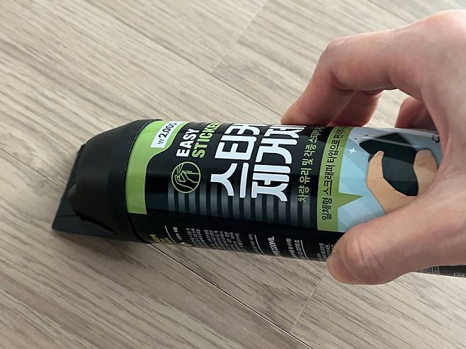 그다음 헤드 부분으로 스티커 부분을 긁어 내 보세요. 손톱으로 긁어도 잘 안 떨어지던 끈끈한 잔여물이 마법처럼 깔끔하게 분리되어 떨어집니다. 오래되어 방치했던 스티커 흔적이 있다면 이 제품으로 말끔하게 지워 보세요.