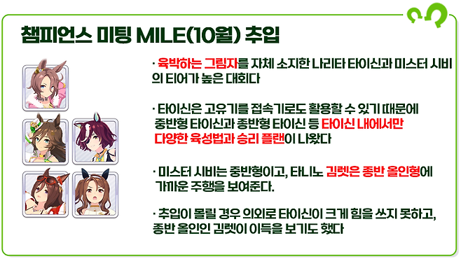각질별로 에이스를 하나씩 두는 전통적인 편성이라면 전광석화 + 메지로 라이언 + 응원킹 등 다양한 가속기와 종반 속도기를 채용하는 형태로 타이신을 육성하면 됩니다. 대신 종반형 타이신도 결국 각질 비율이나 레이스 페이스에 따라 성적이 출렁인다는 것은 알아둡시다.