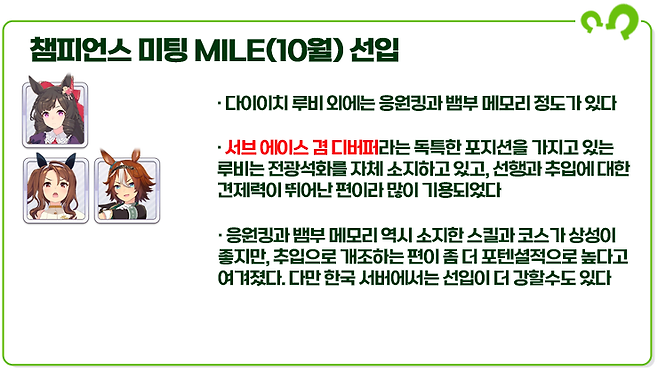 각질별 에이스를 만들면서 선행에는 종반형 에이스, 추입에는 중반형 에이스를 쓰는 등 에이스끼리 시너지가 날 수 있게 서로의 영역을 침범하지 않도록 팀을 완성해야 합니다.
