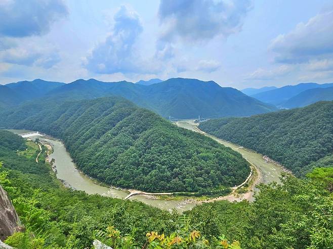 경북 봉화군에 자리한 ‘범바위 전망대’는 낙동강이 휘감아 흐르며 만들어낸 독특한 물돌이 풍경을 한눈에 담을 수 있는 곳이에요. 전망대에 오르면 강물이 만들어낸 태극 문양이 펼쳐지고, 그 곡선을 따라 이어지는 산세가 마치 한반도 모양을 닮아 보는 이로 하여금 감탄을 자아냅니다. 단순한 뷰포인트를 넘어 자연이 만든 지형 예술 작품 같은 이 풍경은 봉화를 대표하는 절경 중 하나예요.