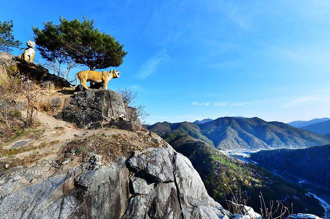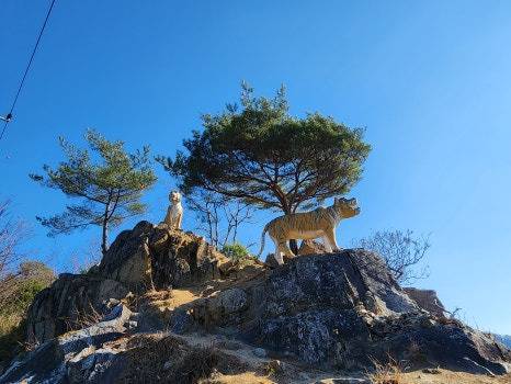 ‘범바위’라는 이름에는 흥미로운 이야기가 숨어 있어요. 고종 때 선비 강영달이 조상 묘소에 절을 올리다 우연히 마주친 호랑이를 맨손으로 잡았다는 전설이 전해지죠. 실제로 전망대 옆 바위 위에는 그 전설을 형상화한 호랑이 조형물이 자리하고 있어, 사진 포인트로도 인기예요. 전설과 풍경이 어우러진 이 공간은 잠시 멈춰 서서 여유를 즐기기에 충분한 장소입니다.