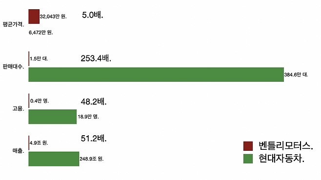 - 역시 맥락이 전혀 안 맞는 말이다. 비싼 차가 일자리를 더 많이 만드는 것도 아니고 세금이 무겁다고 팔릴 차가 덜 팔리는 것도 아니다. 벤틀리모터스와 현대자동차를 비교하면 벤틀리가 5배쯤 비싸지만 직원 수는 현대차가 48배나 많다. 1인당 매출액도 현대차가 13억 원, 벤틀리는 12억 원으로 현대차가 더 많다.