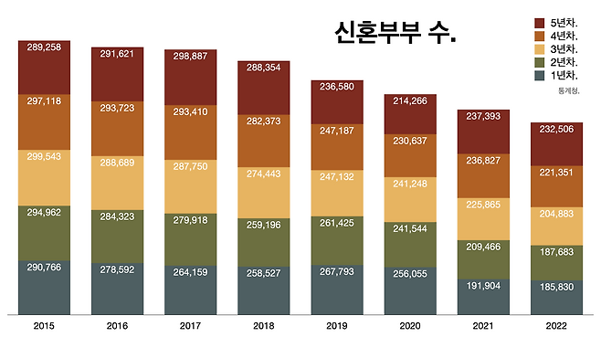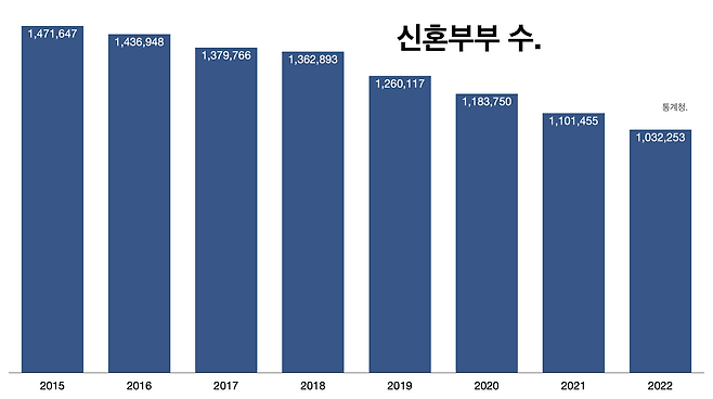 - 신혼부부 건수에서 설명이 좀 더 필요할 것 같은데요. 2015년부터 통계를 작성했는데 147만 쌍에서 2022년 103만 쌍으로 줄었습니다. 혼인 신고한 뒤 5년이 지나지 않은 부부 가운데 혼인관계를 유지하고 국내에 거주하고 있는 부부를 집계한 것입니다.