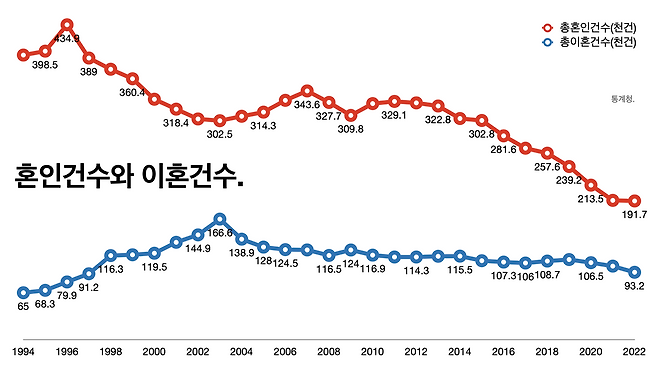 - 실제로 혼인 건수만 놓고 보면(재혼 포함) 1996년 43만 건에서 2022년 19만 건으로 줄었습니다. 아래 그래프를 첨부합니다.