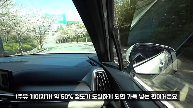 그리고 제가 보통 주유하는 습관은 기름이 약 50% 정도에 도달하게 되면 가득 넣는 편이거든요. 울산 시내가 리터당 1,570~1590원 정도인데 가 득 넣게 되면 대략 한 5만 원 정도 나옵니다. 그렇게 100% 가득 주유를 했을 때 총 주행 가능 거리는 처음 차 출고 됐을 때는 950km 정도 떴거든요. 지금은 1,020km까지 떴습니다.