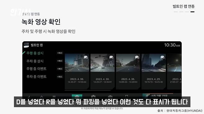 그리고 기어를 D를 넣었다, R을 넣었다, 파킹을 넣었다는 것도 다 표시가 됩니다. 그래서 어떻게 보면은 이 옵션을 추가하게 되면 따로 블랙박스 추가할 필요도 없고요. 요거로 추가하게 되면은 어떻게 보면 괜찮죠
