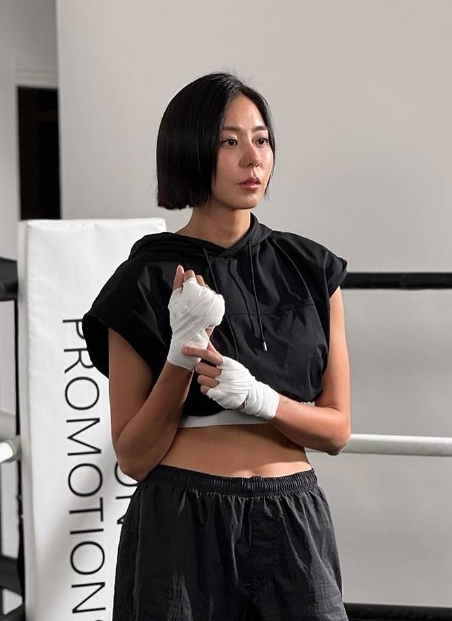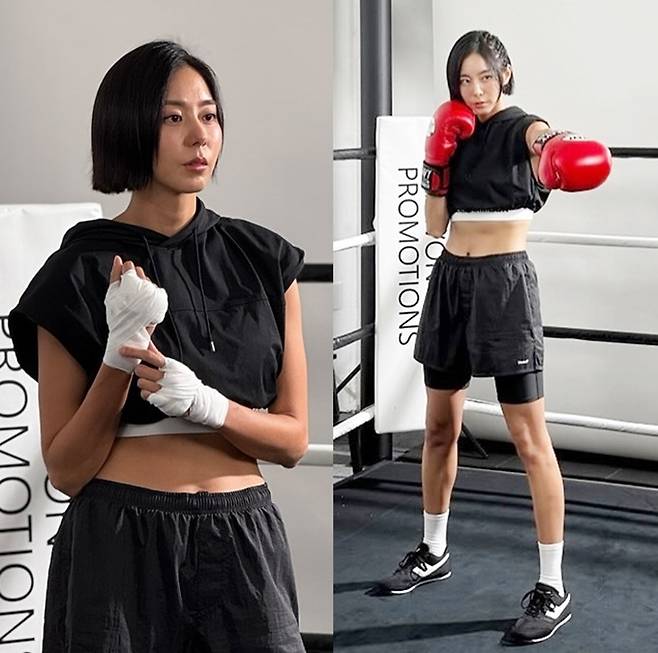공개한 사진에서 유이는 크롭 후드 슬리브리스 톱에 블랙 숏팬츠, 그리고 바이크 쇼츠를 레이어드한 블랙 톤의 운동복으로 완벽한 복싱 애슬레저룩을 선보였다.