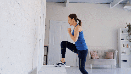 스텝박스나 오를 수 있는 안정적인 도구 앞에 선 자세로 시작합니다. 오른발을 도구 위에 올립니다. 왼발을 들어 공중으로 무릎을 높이 올립니다. 왼발을 다시 내리며 시작 자세로 돌아옵니다. 다리를 바꿔가며 반복하세요.