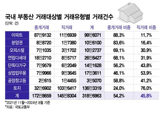 최근 2021년 11월부터 지난 8월까지 34개월 간 체결된 국내 부동산 거래 약 318만6963건 중 중개거래 비중은 54.2%에 그쳤다. 나머지 45.8%가 불법·무등록 중개를 포함한 직거래였다는 사실은 아직 한국 부동산 시장이 성숙하지 않았다는 반증이다.