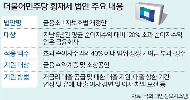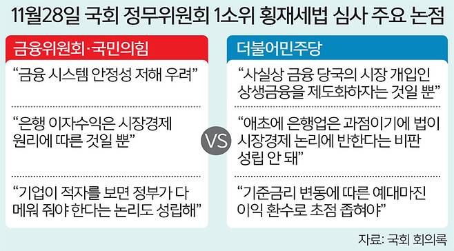 정부와 여야 정치권은 지난달 말 국회 정무위원회 법안소위에서 횡재세법을 놓고 일합을 겨뤘다. 회의록(11월29일)에 따르면 금융위원회와 여야 위원들은 은행권의 사회적 기여 강화가 필요하다는 데는 이견을 보이지 않았다. 그러나 횡재세법에 대해선 금융위와 여당이 “시장경제 원리에 반한다”고 비판했고, 야당은 이에 “일종의 과점 시장인 은행업 특수성을 고려하면 적절치 않은 지적”이라고 맞섰다.