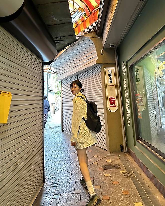 첫 번째 사진에서는 골목길을 걷는 김아랑이 아이보리 계열 셔츠형 원피스에 스니커즈, 그리고 블랙 백팩을 매치한 모습이 담겼다. 셔츠의 잔잔한 패턴이 전체적인 톤을 무겁지 않게 만들어주며, 발목 위까지 오는 양말로 스타일에 포인트를 더했다. 헤어스타일 또한 깔끔한 로우 포니테일로 마무리되어 내추럴하면서도 단정한 인상을 준다.