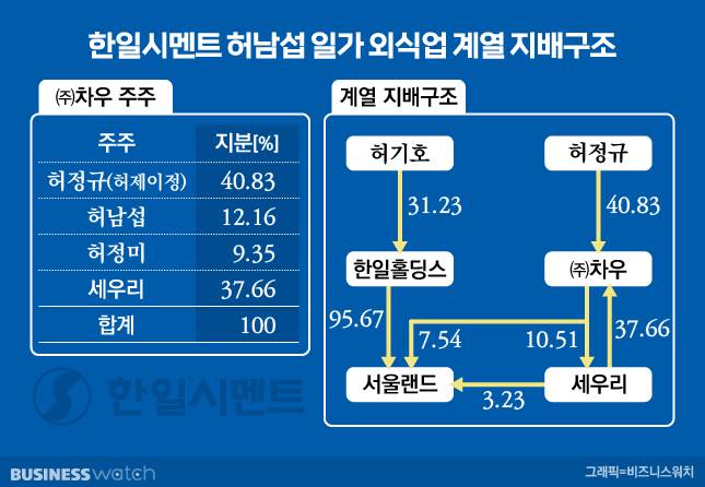 집안 소유의 외식업체도 있다. ㈜차우와 세우리 등이다. 서울랜드 내의 식당 및 카페 등을 운영하는 곳이다. 비록 한일시멘트(계열사 33개) 소속이지만 실질적 주인이 허 명예회장 일가다. 각각 2002년(설립), 2003년(인수) 일가 소유로 편입했다.