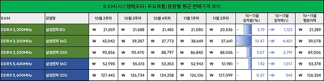 오픈마켓 채널 최종 거래 성사금액 기준으로 삼성전자 DDR4 3,200MHz 8GB(-5.19%), 16GB(-10.47%), 32GB(-3.07%). 에 달해, 삼성전자 DDR4 메모리는 용량에 따라 최대 -10% 가량 저렴해졌다.