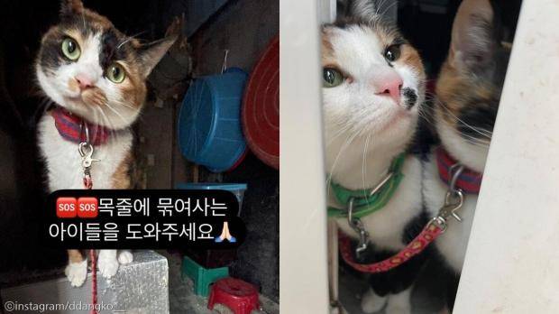 이 고양이들은 창고 안에 몇 년째 목줄에 묶여 살고 있다. 현선 씨는 "할머니가 키우시는 고양이인데, 한 마리가 로드킬로 세상을 떠나자 남은 두 고양이를 묶어서 기르고 있다고 했다"고 설명했다.