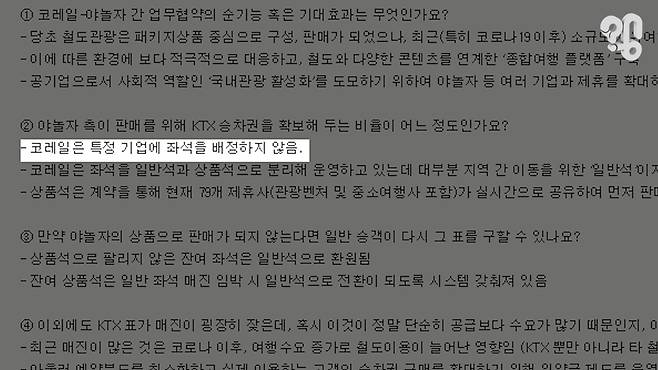 “야놀자 사이트에서 구입하실 수 있는 좌석들이 매일매일 열차마다 딱 정해진 있는 게 아니라고 알고 있어요. 그래서 비율도 말씀드리기가 어렵고...상품석이 일반 좌석으로 환원되는 시점도 비율에 따라 다를 수도 있는 거고 시점에 따라 다를 수도 있는 거고...”