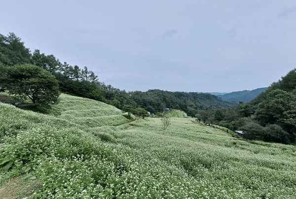 이곳은 경사면이 있어 걷기에 다소 힘들 수 있지만, 울창한 산과 푸른 하늘 아래 펼쳐지는 메밀꽃밭은 충분히 가치 있는 여행지이기도 한데요. 방문시에는 꼭 걷기 좋은 운동화를 신는 것을 추천드리니 사전에 참고하시길 바랍니다.