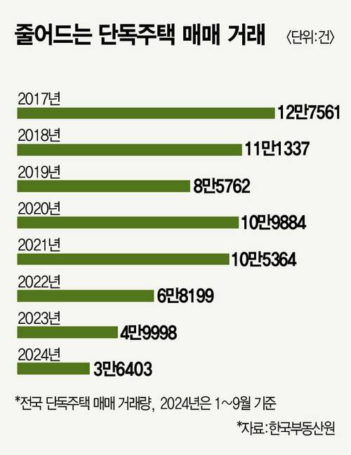 통계청에 따르면 전국 단독주택 매매 거래량은 2017년 12만7561건에 달했지만 점차 줄더니 2022년(6만8199건)으로 반 토막 났고, 지난해에는 4만9998채가 사고팔리는 데 그쳤다. 올 들어 9월까지 거래량은 3만6403건으로 연말까지 4만건에 못 미칠 가능성이 높다. 2017년 서울에서만 단독주택 1만7464채가 사고팔렸지만 지난해에는 매매 거래 건수가 2403건에 그쳤다.