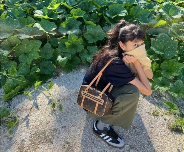 톱배우로 자리매김한 정호연은 카고 팬츠를 연상케 하는 카키 컬러의 팬츠와 블랙 반팔 티로 편안한 데일리 룩을 보여줬다. 모노그램 패턴이 돋보이는 루이비통의 숄더백으로 룩에 고급스러운 포인트를 준 모습이다. 자칫 밋밋해 보일 수 있는 룩에 삼바 비건을 착용해 이른바 꾸안꾸 데일리 룩을 완성했다.