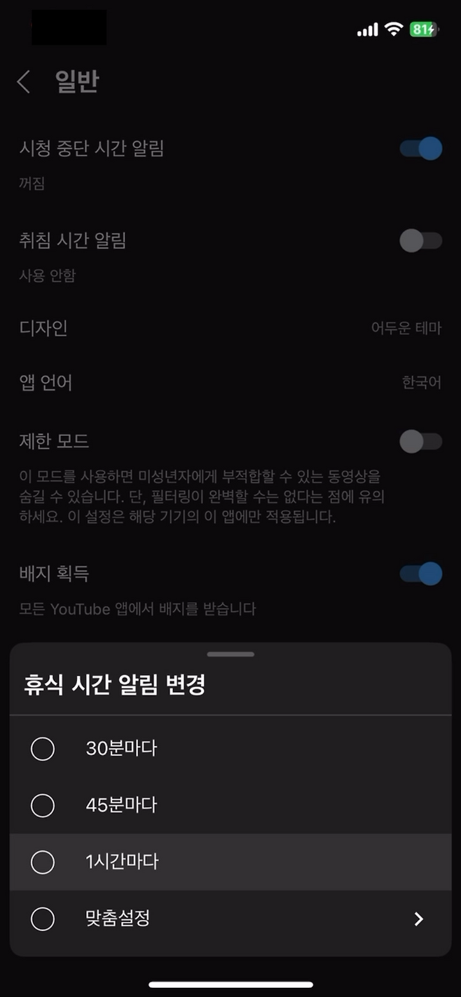 [설정 - 시청 시간 - 휴식 시간 알림에서 시간을 설정]하면, 내가 정해둔 시간마다 '선생님, 지금 유튜브 30분 넘게 보고 계신데요? 괜찮으세요?'라는 뉘앙스의 알림을 받을 수 있습니다.