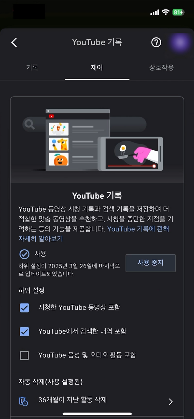[설정 - YouTube의 내 데이터 - 유튜브 시청 기록 사용 비활성화]