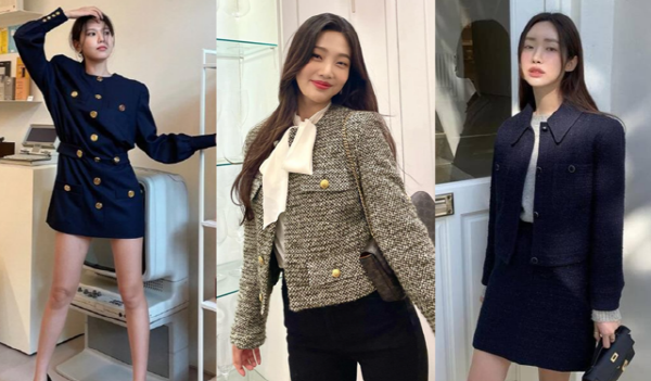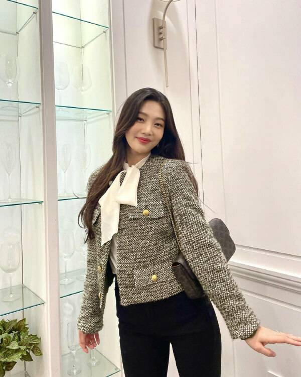 트위드 재킷이 지닌 우아한 매력에 빠질 차례. 결혼식 하객룩으로 빠짐없이 등장하는 트위드 재킷은 봄, 여름, 가을, 겨울 사계절 내내 활용하기 좋다. 트위드 재킷은 다소 올드해 보일 우려가 있으니, 조이처럼 리본 블라우스를 함께 매치해 트렌디함을 가미시켜 볼 것. 조이는 블랙진을 매치해 활동성을 높이며 센스 있는 하객룩을 선보였다.