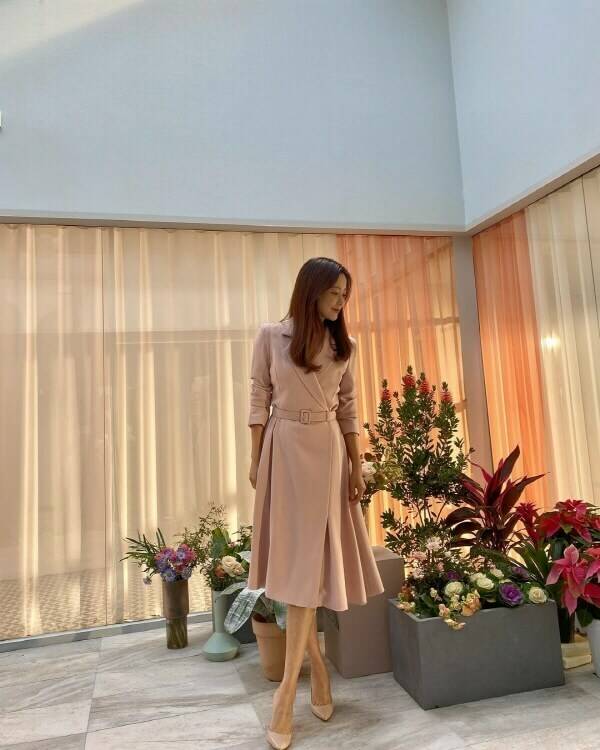 실패 없는 하객룩을 완성하고 싶다면, 김희선의 롱 원피스 룩을 참고해볼 것. 김희선은 재킷 디자인의 롱 원피스를 선택해 포멀하면서도 여성스러운 매력을 뽐냈다. 롱 원피스는 그 자체만으로도 단아하면서 클래식한 느낌을 주기 때문에 간단하게 액세서리나 컬러감 있는 슈즈로 코디를 완성하면 된다.