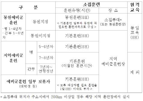 대상자들은 6월 2일과 12월 초순 중 소집부대(동원지정자인 경우) 또는 지역예비군훈련장에서 소집훈련을 개인별로 하루(8시간) 받게 된다.