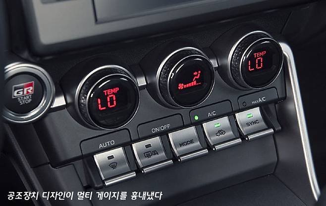 토요타 GR86은 첨단의 차량도 아니고, 대단한 성능의 차량은 더더욱 아니다. 오늘날의 관점으로 본다면 대략 1990년대의 기술과 감성의 파워트레인에 약간의 요즘 감성을 더한 디자인을 가지고 있다고 할 수 있을 것이다. 실내에도 전자화가 일부 돼 있는 걸 볼 수 있지만, 클러스터와 공조 장치의 구동은 디지털 기술이 적용돼 있는데, 그 형태는 마치 터보 압력 게이지와 오일 압력 게이지 등 과거의 아날로그 게이지 감각의 디자인을 보여준다.