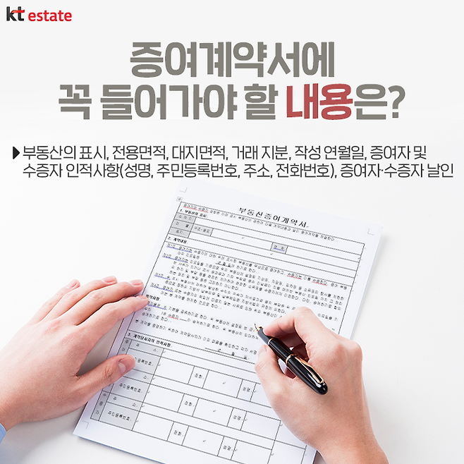 증여계약서를 작성할 땐 부동산의 표시, 전용면적 등은 등기부등본이나 등기필증을 보고 작성하면 되며, 거래 지분은 증여자가 수증자에게 지분 얼마를 증여할지를 적으면 됩니다. 이를테면 지분 절반을 증여할 계획이라면 ‘2분의 1’이라고 적으면 됩니다.
