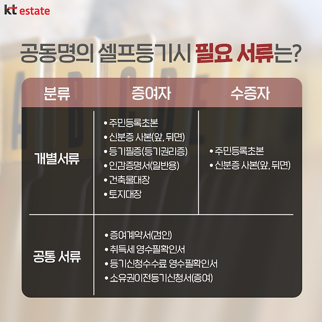 이에 시장에서는 공동명의 셀프등기에 관한 관심도 늘고 있는 상황입니다. 공동명의를 하게 되면 종합부동산세 또는 양도소득세를 절세하는 장점이 있기 때문입니다. 일반적으로 주택 등기 시 법무사에게 맡기면 적게는 20~30만원에서부터 많게는 수십만원에 이르는 수수료를 내야 하는데요. 금일은 스스로 주택 공동명의 셀프 등기를 하는 법에 관해 알려드리겠습니다.