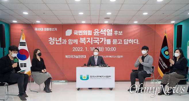 | ▲ 지난 1월18일 국민의힘 당시 윤석열 대선 후보가 서울 영등포구 사회복지사협회 간담회에서 청년사회복지사의 발언을 듣는 모습. |