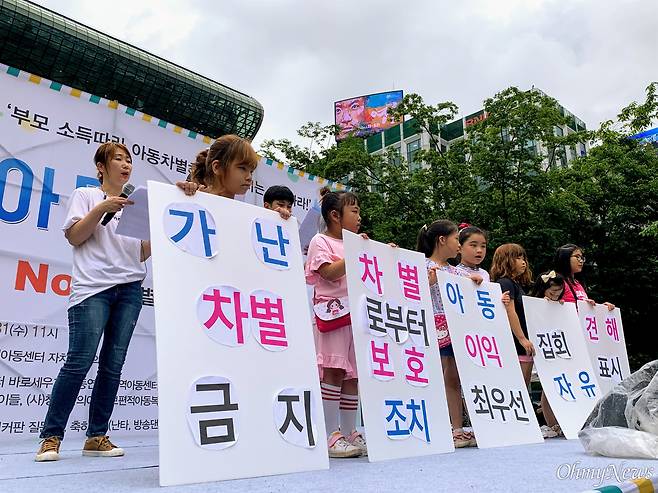 | ▲ 서울시 지역아동센터 교사와 학생 200여 명이 2019년 7월31일 서울시청 앞 광장에서 ‘아동권리대회’를 진행하는 모습. |