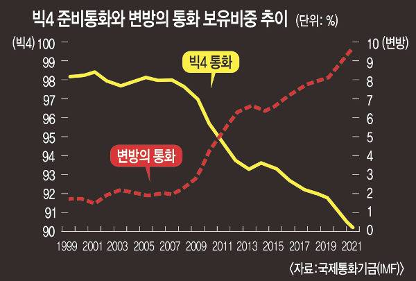 보고서는 미국 달러화의 글로벌 보유비율이 1999년 72%에서 2020년 61%로 줄어드는 등 지배력이 점차 쇠퇴하는 데 따른 공백을 어떤 통화가 메울 수 있는지를 짚었다. 아이러니한 점은 미 달러화와 함께 ‘빅4’로 통하는 영국의 파운드, 유로, 일본 엔화 등 IMF의 SDR(특별인출권) 바스켓 통화들이 그 자리를 대신하지 못하고 있다는 사실이다. 이들 통화도 미 달러처럼 보유비중이 줄어들고 있는데 2008년 글로벌 금융위기에 대응해 해당국 중앙은행이 금리를 크게 인하한 영향이 컸다. 이들 빅4 통화는 통화가치가 안정돼 금과 함께 대외지급을 위한 준비로 각국이 보유하고 있는 ‘준비자산’의 일종인 준비통화로 불려왔지만 그 위상이 예전 같지 않은 것이다.